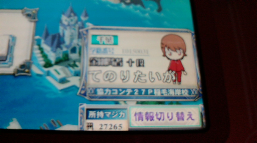 所沢から2時間はきつかったぜ。 今の自分には遠征できるような体力ないな、と感じた。 で、一部だけだけど観た感想。 とりあえずクロノ・トリガーはアニメ化しろよ。 ディシディアみたいな声優つければたぶん大丈夫なんじゃないか。 次にミルキーホームズ。 やっぱりかわいい。 自分でもこんなのが好みなのか?っていう疑問が湧いてきた。 自分が実際にプレイしてみたゲーム系統について。 ラブプラス3Dをちょっとやってみた。 スタッフ「このゲームをプレイしたことはありますか?」 自分「ありません。キリッ」 とかいいつつ真っ先に高嶺愛花を選ぶ自分。 見た感じ3人のヒロインの中では愛花が一番好みかな? でも自分の周りで愛花好きの人がいないんだが。 性格とかさっぱりわからんので 実際に他のキャラもプレイしたら他のキャラに乗り換えるかも。 今回自分がやったのは写真撮影モード。 DSを上に傾けたり動かしたりすると視点が動く仕組み。 なので下から視点にすることもできるみたいです。 スタッフ「スカートの中を覗こうとすると怒られます」 と、スタッフが言っているときにヒロインに怒られる自分。 そりゃやりますよ。 あとは適当にやって終了。 とりあえずラブプラスを初めてやった感想。 あのさ、これ人前でやるゲームじゃないよね。 電車の中で上に持ち上げたりとかしたら警察呼ばれる可能性あるよな。 他には三国無双6猛将伝の3Dをプレイ。 とりあえず目が疲れる。 でも20分ほどやったけど続きやりたいなーとは思った。 でもこれだけのためにPS3買おうとは思わなかったし そもそも家でゲームしている暇がないので 仮に買ってもつんどく状態だろうなあ。 あとVITAをやりたかったんだがさすがに90分待ちは無理だったので諦めた。 TGSのことはこんなところかな。 まずどこまで書いても問題ないのかがわからん。 すでにアウトの内容を書いていたりして。 で、TGSの後はここでQMA。 千葉初上陸。 ここはデパートの中にあったのでなかなか新鮮でした。 ただ後ろで走りまわる子供が危険極まりなかったのだが。 少し時は遡って。 コナミ公式キャロム所沢大会 てのりたいがは逃げ出した。 ムー大陸 大会のためホームで協力プレイできないので このゲーセンに初上陸。 ベストワンから5分かからないとかなんで今まで気づかなかったんだ。 で、ここで2時間くらいプレイしたあとに キャロム大会に参加した知り合いたちが来ました。 当然キャロム大会に参加しなかった理由は聞かれたので 一応返答はしたのですが ここ最近全くと言っていいほど大会に出る気が起きない。 負け癖がつきすぎているせいだとは思うのだが 本当の理由は自分でもよくわかっていない。 この日はほとんど他のお客がいなかったので みんなで一斉に協力同時プレイ。 つーか軍団プレイと言った方が正しいような気が。 にしてもこれやばすぎるだろ。 ラスボス全答クリアとか今まで一度もなかったし。 おかげさまでプラチナがっぽり稼ぎました。 でも今の自分強くなるためじゃなくて 本当にプラチナ餌食だなーと感じた。 天賢者になったら協力は控えめにした方がよさそうだとも感じた。 とかいいつつろくに復習はしないんだろうが。 現在プラチナは290枚。 なので来週には天賢者にはなれるかと。 そしたらトナメメインに切り替え予定。 隣で知り合いのトナメ見ていたけど まず決勝で何のジャンルをメインに投げるところから悩みそうだなー。 世間では今週は3連休で 真ん中の3日間に休みとればシルバーウィークになるらしいっすね。 7月8月に公休日になった日の振替になっているのだが 自分は今月の祝日は仕事なのでなんとも羨ましい。 さらに平日にはもうほとんどQMAをプレイできないのはかなり厳しい。 PR この記事にコメントする