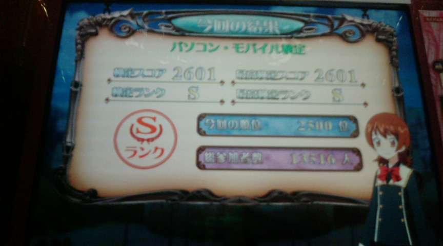 3クレでS取った。 レトロゲーム検定より簡単にS取れたんですけど。 Ⅵの時にはパソコン検定多少は勉強したけど面倒になってSにしなかったのに。 理系の問題に助けられたというのが一番大きいかも。 でも今回の検定はあまりはまりそうに無いのでしばらくはやりそうにないです。 京奈良検定は1クレで完全放置。 早くヒロイン検定来い。 アマガミ。 マンガ版出ていたんだな。 結局買わなかったけど。 マンガ喫茶行ったときについでに見る。 今日の深夜に第2話あるけどリアルタイムでは見ない。 先週の金曜日マジで死にかけたので。 金曜帰ってきたらどこかにアップされているでしょうから コメントでも見ながらのほほんと見ます。 にしても森島編があるってことは他のキャラ編もあるんだろうけど 七咲編はあると予想。 森島先輩に次ぐ人気キャラのはずなのに 1話にほとんど出てこなかったからというのが理由だけど。 それにしてもストーカーはいつ出てくるんだろう。 サッカー。 決勝はオランダ-スペインらしいですね。 でも自分の興味はどっちが勝つかじゃなくて タコのパウル君が予想を当てるかどうかだからな。 この前のW杯では決勝だけ予想が外れたらしいですけど 今回は決勝も当ててもらって的中率100%にしてもらいたいですな。 PR この記事にコメントする