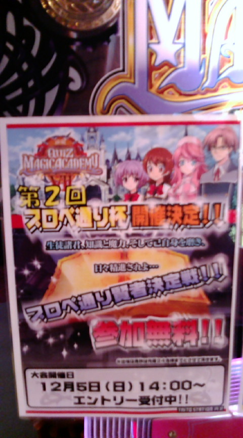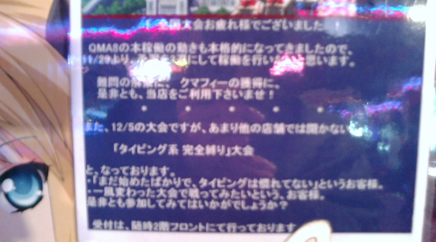キーボード系とサブジャンルのすべてが使えない大会です。 自分が最初縛りでルールを勘違いしたので 他にも勘違いする人はいるんじゃないかと思ったので。 関東で開催される大会まとめの所には詳しいことが書いていないのでここで。 しっかし時間まで不明と書いてあったのはどうなんだか。 とりあえず写真をうp。 シャロンの目が美しい、とかどうでもいいことを思ったのは俺だけでいい。 写真では見辛い部分もあるかと思うので 文章でも詳細書きますね。 日時12/5 14:00~ 場所 タイトーステーション所沢店 参加費 無料 一応事前エントリーですが前回は当日でも受け付けたので たぶん今回も当日でも大丈夫かと思います。 で、ルール。ここ重要。 タイピングが出る可能性がある形式は最初から最後までずっと使用不可。 つまりこの大会は タイピング、キューブ、エフェクト、全てのサブジャンル、ランダムが使用不可。 それ以外は使用可能。 2回戦以降は1つ前に使ったジャンルが使えなくなります。 ただし、1つ前に使った形式は連続して使用可能。 あと、前回は対戦相手が決まる前に使用するジャンル、形式を 事前宣告でしたが今回は必要なし。 他にはダミーは今回ノンジャンルセレクトHARDです。 ノンジャンルランダムじゃないです。 こんなもんですかね。 あとここのお店予習3周になったらしいです。 自分は現在トナメなんぞ基本やらないので実際は知りません。 今回おそらく自分の知り合いのほとんどは出てこないような気が。 大半の人がキーボード系とサブジャンルが武器ですし。 で、自分は出るかというと・・・・おそらく出ないです。 日曜日は課題やっているかDDRやっていると思います。 DDRやっていたら終わった頃に汗だくで会場覗きに行こうかな。 ・・なんで、俺出るわけでもスタッフでもないのに宣伝なんかしているんでしょうね? ネタとして書いているくらいしか理由が思いつかん。 まあ前回の事前に使用ジャンル形式宣言はなかなか面白かったから またやってもらいたかったけど。意外と新鮮な感じでしたし。 あと、前回一番笑ったのはスタッフのダミーカードだったけど。 ここ所沢市ですよーー。 さて、自分はこれからひと眠りして、起きたら課題やってアマガミ見て 明日睡眠不足で死にかける準備でもしましょうか。 PR この記事にコメントする
