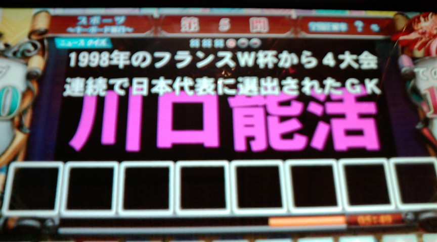 × [PR]上記の広告は3ヶ月以上新規記事投稿のないブログに表示されています。新しい記事を書く事で広告が消えます。 今日この人問題に出すぎです。 少し自重してくださいな。 今日10クレで3回出てきた。 新問、旧問問わず。 一回目が予習だったうえに読めなかったので 実はトナメで出てきた時少しイラっとした。 予習でわからん問題が即座にトナメにも出てくると困りますね。 3回目はさすがに覚えていたがたぶん来週忘れていそうだ。 下の名前が自分にとって覚えにくいし。 来週からワールドサッカー検定あるのにこんな調子で大丈夫か? 今日は11時くらいからモーニングサービスで10クレやったけど 地元が予習2週になっていた。 誰かがキャロムの時の自分みたいに 予習増やしてくれとか申告してくれたのかな? どちらにしてもありがたいことです。 これで朝クマならここでプレイするのがお得になった。 トナメは最初の1クレ目が一番ひどかったような気がする。 大学の構内の敷地?だったような問題で 答えが「キャンパス」を思い出せなかった。ほぼ単独不正解。 よくこの回予選突破できたな。 一週間に一回はかなり厳しいね。 忘れる量と思い出せない量が半端じゃない。 昔は毎週500問ずつ追加だったらしいので 今も毎週500問ずつ増えているとしたら 毎週500問以上覚えないと正解率は下がっていく計算になるし。 まあ実際に出来ていそうなのはドラの人くらいでしょう。 あとは予選の文系セレクト総合が全部◯×だったりした。 自分だけ全答で他の人は2問以上間違えていたりとか この時だけは絶好調だったな。 予選で16人中自分だけ単独もあったしこの回は面白かった。 ちなみに単独正解した問題は 歌人の「小野小町」と 書道家の「小野道風」は どちらも平安時代の人物である 答えは◯です。 このトナメの頃にはだいぶ答えを思い出せるようにはなっていた。 今週は今日一回しかマジアカプレイしていないので 他の時間は家で課題をやっていたことが多かったかな。 また作業用BGM聞いていたら今度は曲名がすごいのがあった。 曲名 チューチュー ラブリー ムニムニ ムラムラ プリンプリン ボロン ヌルル レロレロ 唄 マキシマムザホルモン 自分の好みの曲ではなかったのが残念であるが。 これQMAの順番当てにあるのか?と思わせるような曲名だった。 PR この記事にコメントする