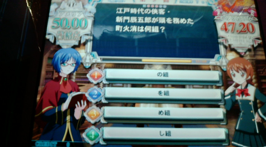 × [PR]上記の広告は3ヶ月以上新規記事投稿のないブログに表示されています。新しい記事を書く事で広告が消えます。 正解は「を組」。 正解率6%。 なんでこれ一桁なのか?と調べてみたら どうやらめ組の大吾の影響からか、め組を選ぶ人が多いらしい。 トナメ 10/2(13クレ) ミノ:2-優-優↑ フェニ:4-9-15-7-9-15-4-7-9-16 10/7(4クレ) フェニ:4-6-優↑ ドラ:4 10/8(20クレ) ドラ:14-10-5-11-9-15↓ フェニ:6-3-7-8-氷優-9-9-15↓ ミノ:3-3-優↑ フェニ:8-14-5 10/9(16クレ) フェニ:3-6↑ ドラ:15-8-16↓ フェニ:12-2-9-2↑ ドラ:15-14-15↓ フェニ:11-6-6-16 ドラがマジできつい。 多答とか順当てまでほぼ少数不正解になるからどうにもならん。 平均60越えしていても0点とか平気で取るので ぶっちぎりの最下位を取ることが多い。 それと今作のCOMマジで自重しろ。 これはミノだけど ボーダー60点とかひどすぎる。 予選でも100点越えとかしょっちゅう見るし。 まず、ミノに宝石賢者がいる方が問題なのかもしれないが。 プロフィール 変えました。 トナメをメインプレイに切り替えて50クレは超えたので グラフは前作とほぼ同じになってきた。 のだが、今作60%切っているし。 数値だけだと成長しているどころか下がっている。 前作と比べてドラやフェニに滞在している時間が 長くなっているからだと思いたい。 今作も不死鳥杯やると思うけど 参加しようと思えばたぶん参加できるな。 仕事が忙しくて今年は難しそうな気がしますが。 茶臼指数 スレでこんなネタがあったのでやってみた。 茶臼指数=(得意正解率×3)-(2番手正解率+苦手正解率+総合正解率) らしいです。 自分の場合 (81.59×3)-(69.83+45.91+59.52) =69.51 でした。 69.51はかなりの茶臼らしいです。 金剛賢者(笑)。 戦場のヴァルキュリア 携帯FLASHからなんだけど このフレーズが凄まじく印象に残った。 ヴァルキュリア一度もやったことないので そのうちやりたいなー、とか思ったり。 でもこの三連休でやれそうにないので 結局未プレイのままで時が過ぎていくんだろうなー。 3連休でも短いと感じる。 もっと休みが欲しいです。 PR この記事にコメントする