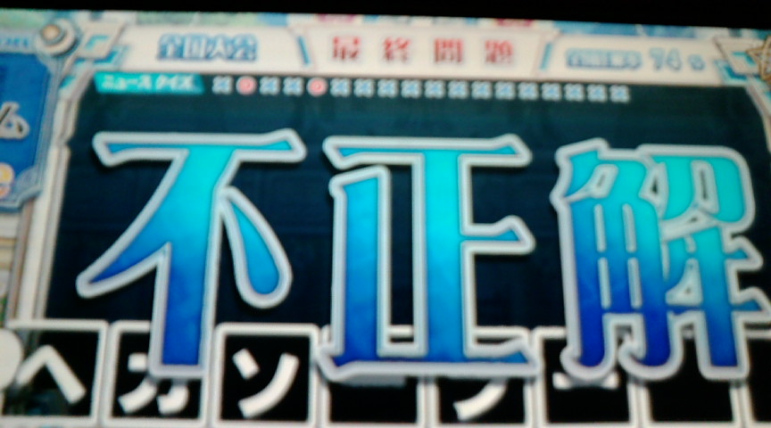 長かった。 あと残り4000個くらいです。 が、ミノフェニの自分にとっては 4000個という数字は相当きついものであります。 ここ数日は協力を中心にプレイしていたが なかなか4人揃わなかったので途中から全国に切り替え。 ストレスはたまるけどやっぱり全国の方が魔法石はたまりやすいんだよね。 あと、十段昇格時には全国でプラチナをgetしました。 宝石賢者昇格時にもプラチナがもらえるような展開だといいな。 で、今回の全国の結果 2-1-7-5-6-1 ACEは5回 プラチナは1個 前回と違ってプレイしていない。 というより今回アニゲと理系がほとんど飛んでこなくなったので 全然問題が解けなかった。 で、一番最悪だったのがこれ。 2問しかあっていねえし。 あとこの問題の答え知っている人ならよくみればわかるけどタイポしてます。 自分でもわかっているんだけど 前半崩れると後半ずっと崩れっぱなしになりやすい。 特にQMA大会決勝の後半とか。 主に精神的なものによるものなんだけどどうにかならんかな。 今回は一番最初の自選でモロに自爆したのが原因。 で、これの結果。 まさかの0点だぜ。 笑いたければ笑うがいいわ。 あーっはっはっは。 これの直前には1位とってプラチナ取っているんだぜ。 つまりこれは白金十段初プレイです。 金剛賢者初プレイ時にはこんな酷い結果にはしないようにしたいです。 こんな感じでeasyですら外すので ちょっと☆3くらいまでの問題を鍛えたいなーって思っているんだけど easy縛りしているサークルってあるのかな? 宝石になったらちょっと探してみようかと。 明日は新しい塔なので 協力プレイをガッツリプレイする予定。 PR この記事にコメントする