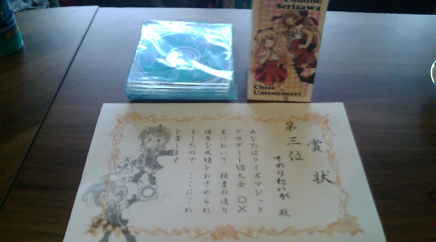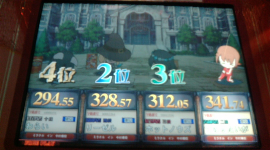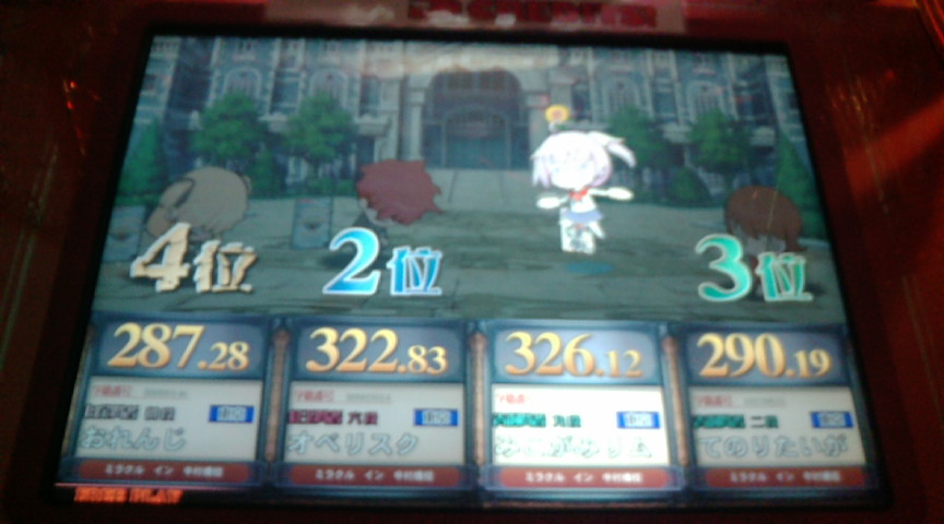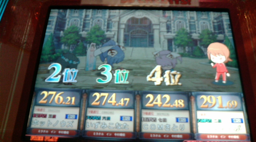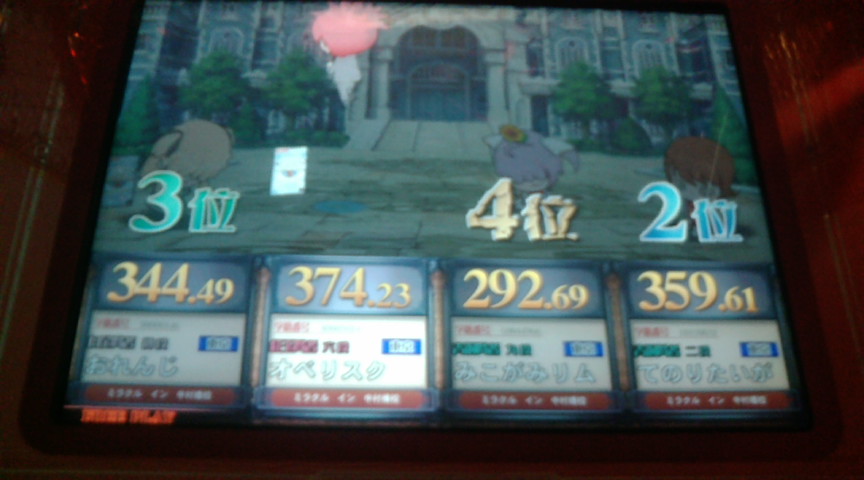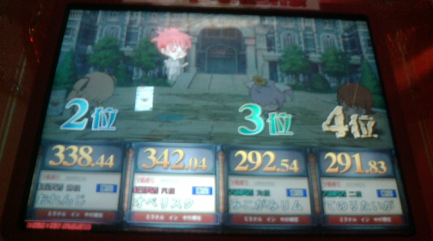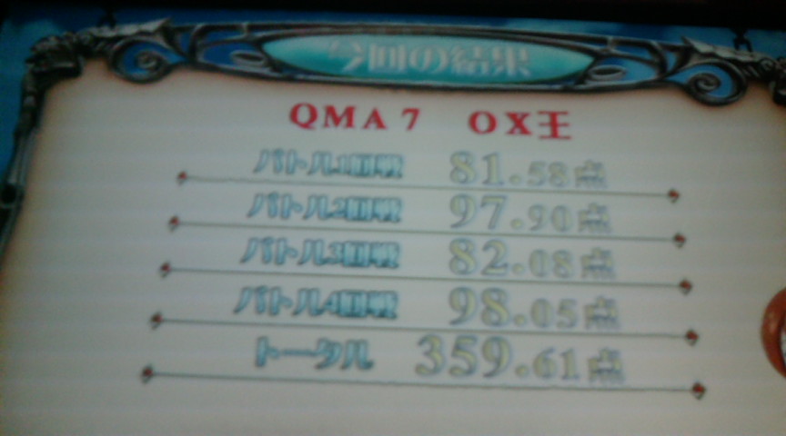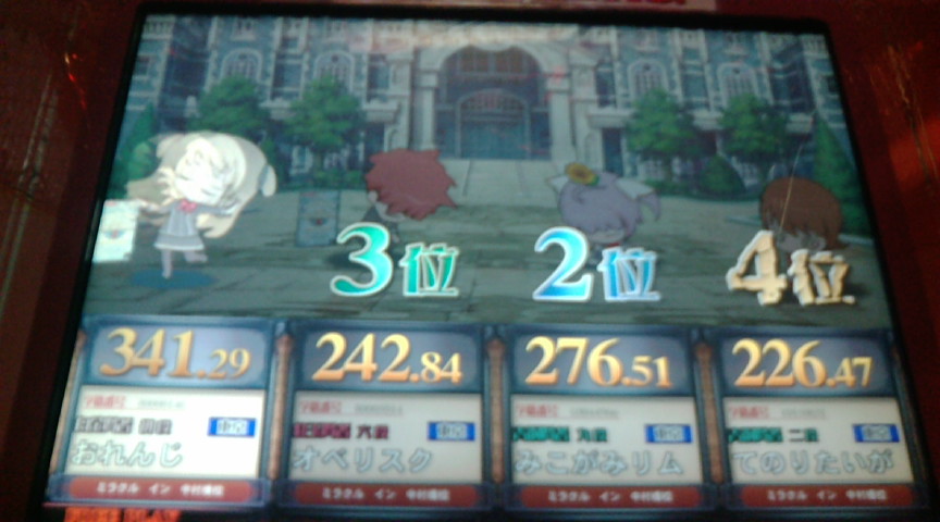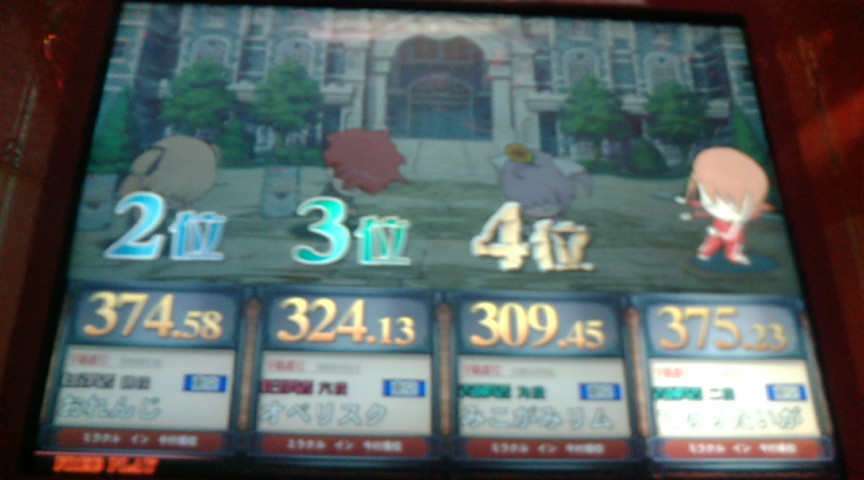 まず結果を言います。 3位でした。 非常にいい成績でした。 そして優勝のチャンスを逃すという非常に悔しい大会でもありました。 10月のブーボス大会より今日までの2週間。 スポーツ縛りで初見だらけのため260点というひどい点数を取ってから とにかく自分は回収量が足りないことを自覚する。 2週間100円3クレ店にて セレクト回収装置を使いひたすらやりまくった。 総クレ数249クレ。 回収した◯×の問題数13208問。 大会前日~大会直前まで 前日は武器の理系を復習する。 さすがに眠すぎて頭が働かなくなったので 当日5時に起きてからアニゲの復習を始める。 しかし4時間ではアニメ全部と一部の漫画まで、 ゲームは全く復習できなかった。 どうやっても終わらないので少し早めに行って 軽くプレイをすることにした。 で、10時40分に着いたのだが 中村橋は11時から開店だった・・・・orz 11時に入店してから1クレだけプレイを始めようとしたら 200円3クレ設定だったため100円玉1枚では筐体が起動せず。 知り合いがいたので店内対戦をしました。 アニゲで初見を2問も引く。 ついでにCOMの並べ替えがさっぱりわからず 不死鳥杯は無理臭いことも実感する。 本番 定員のMAXが16人のはずが32人も集まる。 第一試合は上位2人抜けだが 準決勝は1位のみという非常に厳しいルールとなった。 今日の試合全部ホストだったんだけど。 もしかしたら準決勝、決勝のニコニコ動画は俺視点かもしれん。 写真の数が多すぎるので対戦した4人の結果のみ掲載します。 自分の詳細は最終試合だけ掲載。 それにしてもtwitterで何を投げられたか書いてあるから ここで書くのが随分と楽だ。 試合開始。 第一試合 アニ、スポ、アニ、社会 前半でリードをとるものの最後の社会で失速。 32点はひどい。 とはいえ1位で通過。 準決勝 1位のみ通過のため ここは誰もが厳しいと感じる場面。 自分も厳しいと感じた。 理系、社会、芸能、ライフ 1位通過成功。 とはいえあと一問間違えていたら終了だったとか 考えるだけで恐ろしすぎる。 他の組では1位、2位、3位の点数が 360,359,358という死の組が発生した。 自分はつくづく運が良かったのだと思う。 決勝 まず自分がホストのため全員の対戦相手が発表されるまでの間 相手のグラフを眺めて何を出すか考えていた。 結果全員理系のグラフが5ではなかったので理系を使うことにした。 (実はニコニコで見たらひとり理系のゲージが5の人がいました) 次に一本はノンジャンルを使用することになるのだが 自分は最初は優勝する気はなかったので 自選を全答できれば上出来だろうという考えで最初は理系を投入。 決勝戦第一試合 理系、芸能、ノン、ノン まさかの勝利。 タイム差で勝てたのは非常に大きい。 これで優勝できる可能性が出てきた。 しかし・・・・ このあと地獄の5連戦だったというのを誰が予想したであろうか。 決勝戦第二試合 自分はもうノンジャンルしか投げられないので 戦略もくそもない。 戦略を立てられるのは自分以外の3人。 第二試合の結果 芸能、ノン、スポ、ノン 自分が一位を取ったため完全にマークされる。 ゲージ1のスポーツと芸能が両方飛んできた。 しかも自選のノンで間違えまくったため 完全に冷静さを失う。 とても第一試合で375点取ったとは思えないようなムゴイ点数。 決勝戦第三試合 ノン、スポ、ノン、ノン ノンジャンルが増え始めた。 それと今日初見で2回出された問題を2回同じ間違いをした気がする。 決勝戦第四試合 スポ、ノン、ノン、ノン まだ終わらなかった。 さすがにもう終わってくれと愚痴った。 4試合もやったためここで5分の休憩が入る。 もう自分は完全に落ち着きがなかった。 この5分はべらべら何かを言っていた気がする。 今考えると態度は悪い部類に入っていたかもと思う。 さて、泣いても笑っても 次の試合で優勝者が決まる。 4人が1勝ずつしているので 得意と不得意の違いはあれども 全員の総合の実力は同じであろう。 だがそれは自分にも25%の確率で優勝できるということでもある。 決勝戦第五試合 ノン、ノン、ノン、ノン 全てノンジャンルだった。 まさに◯×王最強決定戦にふさわしい試合であった。 最終結果はこれだーーーーーーーーーーーーーー。 優勝はできなかった。 あと一問正解していればおそらく優勝はできていた。 2問間違えたので一問は何を間違えたかは忘れたが もう一問はスポーツ問を単独不正解したことは覚えている。 やはり最後はスポーツか。 どうして自分はスポーツができないのだろうか。 さすがにこれは悔やんだ。 決勝戦第五試合の試合の詳細。 優勝者はオベリスクさんでした。 おめでとうございます。 自分は5試合の合計点数の結果 3位となりました。 満足した思いと悔しい思いが残った結果となりました。 今回は入賞できたので賞状をもらえました。 緑風EXTRAの時は4位だったので賞状がもらえなかった。 なので賞状は今回が初めて。 俺の家宝になるかもしれん。 大会の後はフリーでしたが 自分は十分