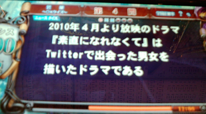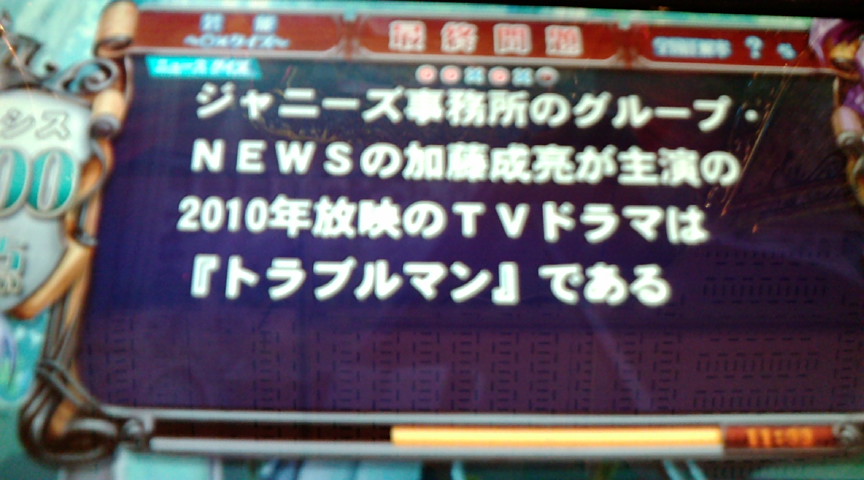 他にも言い方としては レッサードラゴンとか言っているみたいだが 知識がない自分からすればぶっちゃけレッサーは 強いんだが弱いんだか判別がつかない。 ので強と弱みたいなシンプルな言い方が 一番わかりやすい。 自分は現在ほとんど午前中にプレイしているので 2つあるというのはかなり実感している。 ドラ昇格後3戦は10人以上はCOM、 4戦目以降はほぼフルゲート。 で、4戦目で16位とかとってもフェニに落ちないので ほとんど5戦目でフェニに落ちる。 3クレイプが5クレイプに変わっただけ。 だが、この2クレ分の影響が今のところかなり大きい。 ドラゴン組に居続けるほど自分は 正解率がガンガン下がるので 極力ドラには居たくない。 でも今の状況では午前中にしかプレイできないし GTは混みすぎていて席空かないし。 だからといってプレイはしたいというなんというわがまま。 一番気にしているのが制限率大会。 制限率限定大会もほとんどの大会は 制限率下限は設定されていなかったが 国分寺の最初の大会は55%以上という前例があったので 下限に引っかかって出れないという 悲惨な結果だけにはなりたくはない。 噂の職員室 全体を撮るのはさすがに難しかったが 机の部分はまあまあうまく取れたと思う。 で、どうやら左にも机があるのだが 左の机が誰の机なのか全然予想がつかない。 それと一番気になるのはやはりリンゴといわざるを得ない。 ニュースクイズ そこそこ拾った。 でもほとんど芸能。 ↑の答:◯ ↑の答:◯ ↑の答:◯ ↑の答:× ↑の答:◯ 素の知識で答えられたのは1つもなかったぜ。 PR この記事にコメントする
