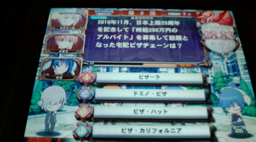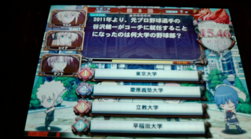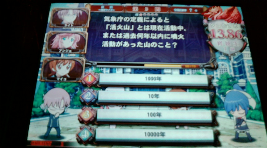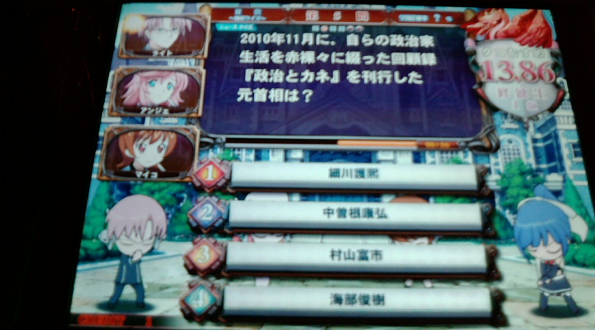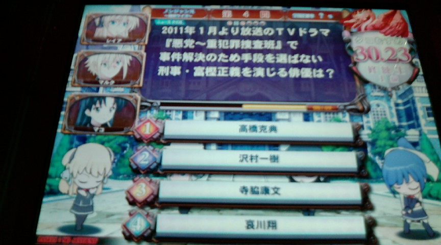 まずはこの問題を解いてみてくれ。 正解は↓ 正解は4でした。 ちなみに正解率は6%です。 素でわかった人はすごいかもしれない。 自分はもちろん外した。 こういう「へえー」って思える問題は4択には少ないけど これは特にひねくれてもいないので良問だと思う。 「へえー」と思える問題には◯×に多いから◯×はやっていて面白い。 エフェクトも「へえー」と思える問題はけっこう多いけど 読めるかーーーって問題の方が圧倒的に多い。 今週配信のニュースクイズ ↑の答:1 ↑の答:2 ↑の答:1 ↑の答:4 ↑の答:◯ 今日拾えたニュースは以上です。 ちなみに今日のプレイクレジット数は48。 今日撮った写真は873枚。 処理できる気がしない。 あと自分のサブカ隠しておくつもりだったけど この前消すの忘れていたし もう別にいいや、と思えてきたので公開します。 深い意味はないです。 問題配信は午前10時? あくまで仮説。むしろ外れてもらいたい話なのだが。 今日は午前8時からプレイしていたのだが 8時から10時まで全く新問が引けなかった。 10時にわざと一回カード抜いて再び始めたら ニュースタグなしの問題も含めた正解率-%を引けるようになった。 で、以前に水曜日の早朝からプレイをして 正解率-%をやたら引いたので もしかしたら問題の更新は 午前7時ではなく午前10時なのかもしれない、と思った。 次火曜日か水曜日にプレイしに行ったら確認したい所だが 冬休みならできる可能性は十分あるが その時期にもニュースクイズが配信されるかがそもそも不明。 ユリの中の人 ユリ、というより広橋さんのキャラは 基本的に魅力的なキャラが多いと思っているのだが 今のところ、それ以上に魅力的なキャラが一緒に登場してしまうので どうしても2番手以降になっていた。 QMAでもそう。 でもサブカで使い始めたけどやっぱ広橋キャラはいいね。 ただQMA8でもメインになりそうにないのが残念なところ。 ところで、広橋さんが主役のアニメってあるんすかね? らき☆すたは平野綾さんに主役取られてしまいましたし。 自分アニメはそこまで詳しくはないので 誰か広橋さんが主役のアニメがあったら教えてくれませんか? 問題集とやら そろそろ更新しようかと思います。 万単位になってくると100問くらい増えてもたいして変わらん気がしてくるのだが そもそもここから先は未回収問題をザックザク拾えるわけではないので これから◯×はこんな感じになっちゃうんだなあ、と思い始めてきた。 PR この記事にコメントする