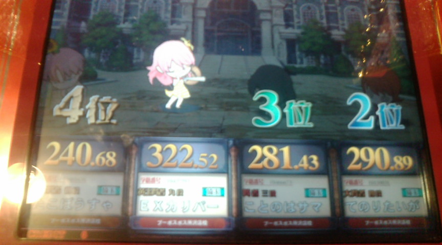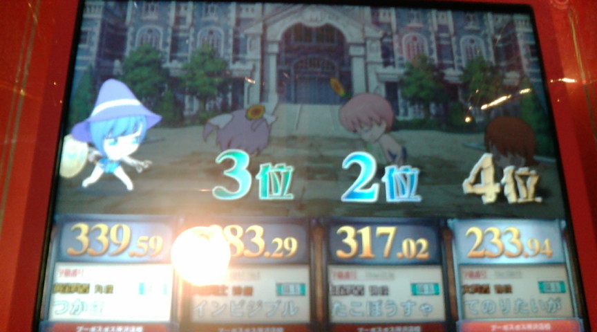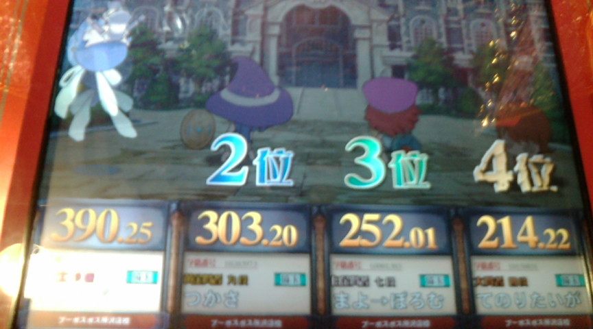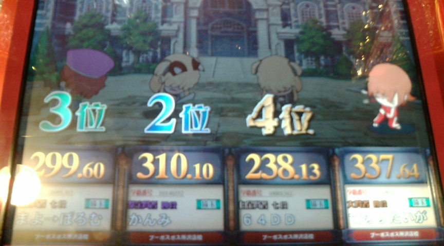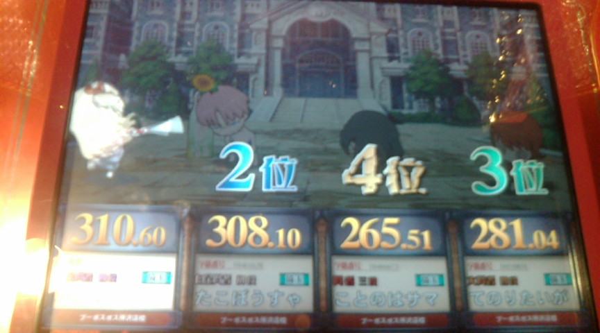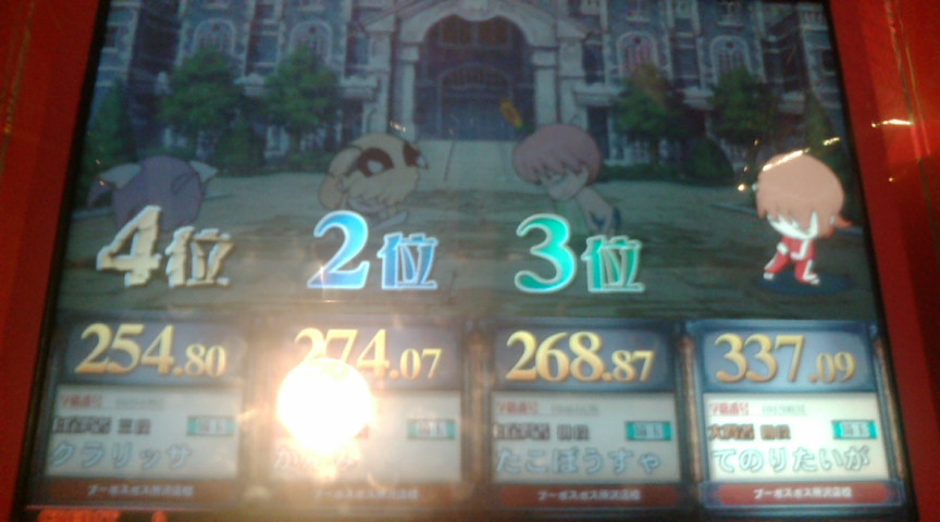 本戦はどうせ1回戦で負けるでしょうから 店内対戦で可能な限り◯×縛りができればいいかなという気持ちで。 それとバカテスのフィギュアを優勝賞品として贈呈しましたが ぶっちゃけ処分するための言い分です。 で、1回戦。 ↑縛り:理系、文系、社会 出題形式は アニメ◯×(自選)→芸能エフェクト→芸能◯×→野球 だったと思う。 ◯×は2ジャンルともあまり刺さらず。つーか多少自分にも刺さっているし。 そしてまさかつかささんから芸能が飛んでくるとは思わなかった。 たこぼうすゃさんは文系と社会が封鎖されているから 野球しか投げようがないでしょうけど エフェクトと野球で大きく離されましたな。 今回の大会は全体的に芸能が多く飛んでいた感じがしました。 そういえば芸能全然封鎖されなかったな。 優勝はEXカリパーさんでした。 宝石9段はさすがに強い。 フィギュアはカリパーさんの手に渡りました。 で、店内対戦。 ↑理系キーボード総合。 エフェクトがさっぱり。 にしても全答はすげえ。 名匠戦ってこんな感じなんだろうなあ。 にしてもなぜノンジャンルはないのだろうか。 ↑理系◯× 初見はラスト一問のみ。 とはいってもジャイアントパンダが今は肉食ではないとか 答えがうろ覚えなのが多い。 愛知までわざわざ行きませんが 間違いなく名匠戦紫ではこんなレベルでは代表は取れん。 ↑スポーツ◯× 総合正解率50%切っているこのジャンルにしては少しは成長したか? 自分の体感的な難易度としては野球がムズイ。 とにかく野球とサッカーは深すぎる。 今回は野球が多めでした。 ↑社会◯× 未回収選択技がたくさん拾えてなにより。 社会◯×の予習はあまりしていないので もう片方の問題も回収できていい感じでした。 にしても今回の優勝者は全体的に固いな。 宝石9段は本物だぜ。 ↑◯×フリー 正確には ノンジャンル→アニメ→理系→ライフスタイル ライフスタイルとか実は今日の朝にちょっと勉強して全部復習していないけど なんとか全答できたという感じ。 アニゲが意外と穴。 一番回収量多いのに一番できなかった。 とはいえほぼノンジャンルで20/24は達成できたので今度は350点を目標に。 次来るときは自分の問題集が10000問超えた時にしよう。 携帯のストックが3000問くらいあるので実現は可能なはず。 冬休みくらいにまたこの大会にお邪魔しようかと思います。 今日は実に充実した一日でした。 自分の問題集はライフスタイルと芸能の確認が終わっていないので 更新は来週中になるかと。 にしても50ヶ所くらい問題文の誤字脱字を修正したり 似たような問題を固めるために順番をかなり変更したり(特に文系) 一週間でいろいろいじりましたな。 まだ誤字脱字はあると思うけど 来週中にはある程度まともになっているかと。 むしろ誤字だらけで公表していたことの方が 別の意味で凄かったと自分で思う。 PR この記事にコメントする