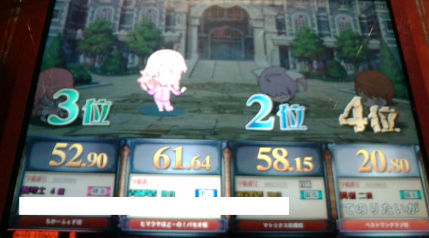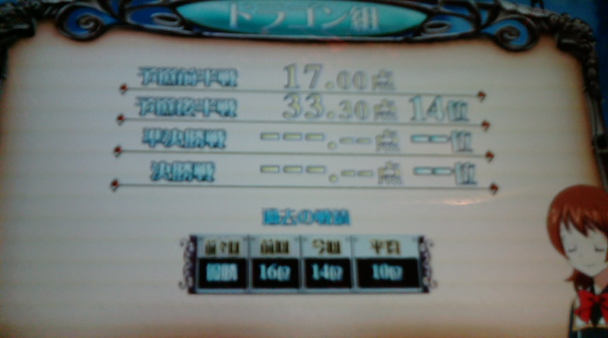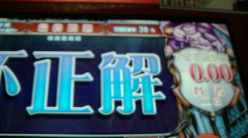 自分が高校生の時にはここのゲーセンの存在を知らなかったぞ。 そもそもいつからこのゲーセンあったかわからないが。 大型連休の間しか行けそうになかったので今日行ってきた。 昔通っていた道をたどればいいだけなので全く道に迷わずにすんだ。 ただ、チャリで30分はきついね。 むしろ自転車本体に負担がかかりすぎている気がした。 夏に時間の余裕ができたら多めにバイト入れて原付買おうかな。 ゲーセン到着。 いやー24時間営業っていいねー。 予想だとすぐに混むだろうと思っていたから 朝一で突っ込んだ。知り合いがいてびっくりしたわ。 どうせ午前7時なんぞ人いないだろうから サブカ作成してプレイ開始。 なぜに作るまで一週間以上かかっているんだ? にしてもマヤ最高! 宝石あきらめたらこっちメインにしようか迷っているくらい。 10時くらいからメインに変更。 つかこの時点ですでに3時間近くやっていることが驚きだ。 まあほぼ決勝行っていたからだろうが。 今日は30クレ近くぶっとばしてプレイしても漱石さん一枚で済むから まさに神設定。 だがトナメはかなりボロボロ。 しかも今のドラはフェニに落ちそうになると弱ドラに行くっぽいので なかなかフェニに落ちない。 自分はさっさとフェニに落ちたいのに。 しかも弱ドラよりフェニの方が周りが強い気がする。 以下情けない結果。 14回目ライフスタイルキーボード(ドラ)。 15回目文系マルチ(ドラ)。 しっかしまさか予選で2回連続で取るとは思わなかったわ。 そしてこれらの問題を難なくこなす強ドラは異常。 あと前回の優勝もcom混じりです。 何気に弱ドラcomが人間蹴落として決勝に残るからな。 今日も魔神には会えず。 そして・・・・・ 初のタライの洗礼。 まあ自分はスポキュー投げて全問自爆すればなるわな。 キューブの調べにくさは異常だから 決勝で投げて問題と答え回収しています。 予習は現在タイピングとエフェクトが中心。 あと電池が切れたのでレトロゲーム検定やっていたらS取った。 なぜに電池が切れている時にSとるんじゃい。 なんだかんだいって今日は6時間もプレイした。 立派な廃人予備軍だね。 今日みたいなプレーはもうやらんだろう。 もう時間の余裕はないし むしろ時間がないとわかっていたから今日廃プレイしたようなもの。 それとここのゲーセン10時から2時くらいまで QMAやりに来た人が1人しかいなかったけど正直言って大丈夫か? 頼むからⅦ終了までは潰れないでくれよ。 帰り道の30分がしんどかった。 もう年かもしれん。