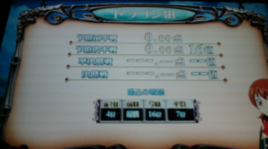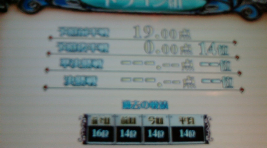 相変わらず弱ドラらしきところでトナメやっていたけど 本当にこっちは毎回com入るな。 で、最初からcomと一緒の場合は決勝は魔神戦にならないみたいだ。 やはりアイス化したcomじゃないと魔神に会えないのか。 で、優勝(ゴールド)したあといきなりフルゲになった上に 周りの階級が一気に跳ね上がった。 しかも周りの強さが鬼強になったし。 弱ドラと強ドラは優勝回数か平均順位が関係していそうだ。 なお正解率はどんどん下がっているので 正解率は関係がなさそうだ。 で、(推測)強ドラ一回目。 12回目。ライフスタイルキーボード(ドラ)。 いうまでもなくこの回は16位。 次の回。 順位の差が激しすぎる。 で、この後(推定)弱ドラに行ったんだけど,やってしまった。 13回目。スポマルチ(ドラ)。 うん、これはムリゲー。 ただでさえアニメマルチもあぶないのに スポマルチなんぞできるわけがない。 スポーツは一応対策し始めたがマルチまではたぶんやらんだろうな。 で、結果。 これはひどい。 が、まだ下に人間が2人いるので問題のグロさはガチ。 ドラとフェニの問題レベルの差がありすぎる。 今日で総合正解率63%切りました。 フェニでは今日はスポーツの成果があった。 準決勝で文字パネルだけど2問ほど少数正解でリード取れたし。 スポーツができるようになればかなり強くなれそうな気はする。 制限時間なんてないのでマイペースで力つけようと思う。 忍者ブログ [PR]