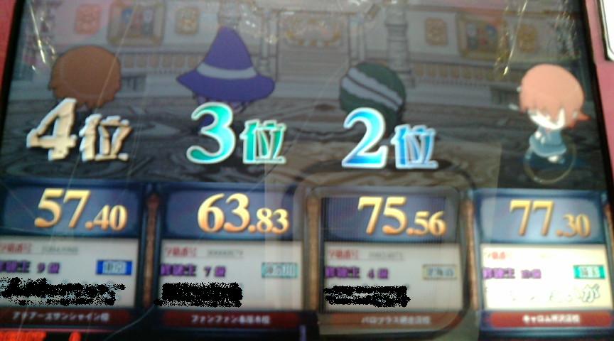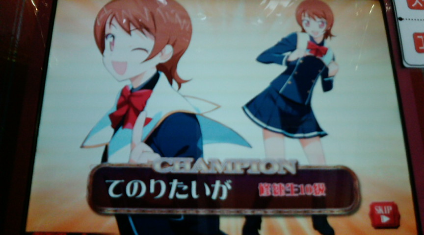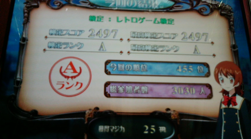予定通りアイコでプレイ。 初プレイ時にはマイルームの存在に気付かず そのままトナメへ。 予習1回が終わった瞬間にトナメが始まりました。 今日は全部で6回トナメやったけど 全部予習2回目の1問目で招集された。 現在のトナメ招集の早さは6のキマイラ並? トナメ開始。 組はミノタウロスですが いきなりノンジャンルランダム。 あれ?ここミノだよね。 ・・どうやら今作はミノはおろかユニでもランダムが出てくるらしい。 初プレイ時には決勝に行くことができた。 決勝の問題は全員☆が上がっていないようで 比較的簡単な問題が多かった。 だが、マルチは相変わらずムズイ。 で、記念すべき初試合の結果。 一位でした。やったね。 で、優勝したときの一枚画像。 今回新規の書下ろしは力が入っているな。 初戦はいい記念となりました。 で、2回目のプレイに気づいたんだけど マジカが37しかなかった。 え、たった37? 購買部で何も買えなかった。 で、トナメを続行。 そのあとの結果。 6位、7位。 ぎりぎりでフェニに昇格。 一応は3クレで上がることはできました。 が、三回連続で決勝はさすがにキツイ。 稼働二日目ということで ミノでもそこそこレベルは高かったような気が。 そのあとのフェニの結果は13位、3位、10位と これからもフェニステイしていそうな結果になりました。 しらばくはフェニステイすることを目標にしようかな。 続いて検定試験。 レトロゲーム検定をやってみた。 2クレではSが取れませんでした。 で、3クレ目をはじめようとしたら・・・ フリーズして再起動かかった。 で、しかもそのあとの検定。 2497点。 なんだよこれは。最終問のNEOGEOを緑で入れたけど こんな結果になった。 このあとも数クレやりましたが 結局Sは取れませんでした。 でも面白かった。 初日にしてはいろいろありましたが プレイしてみてマジで面白い。 予選でいろんな形式が出てくるから 100クレやっても飽きそうな気がしませんでした。 レッスンがないからトナメやりながら 武器作りすることになりますが 今作マジではまってしまいそう。 今作は宝石狙ってみようかな。 次プレイするときは まずレトロゲーム検定をSにするところから始めよう。 初日は満足。 PR この記事にコメントする